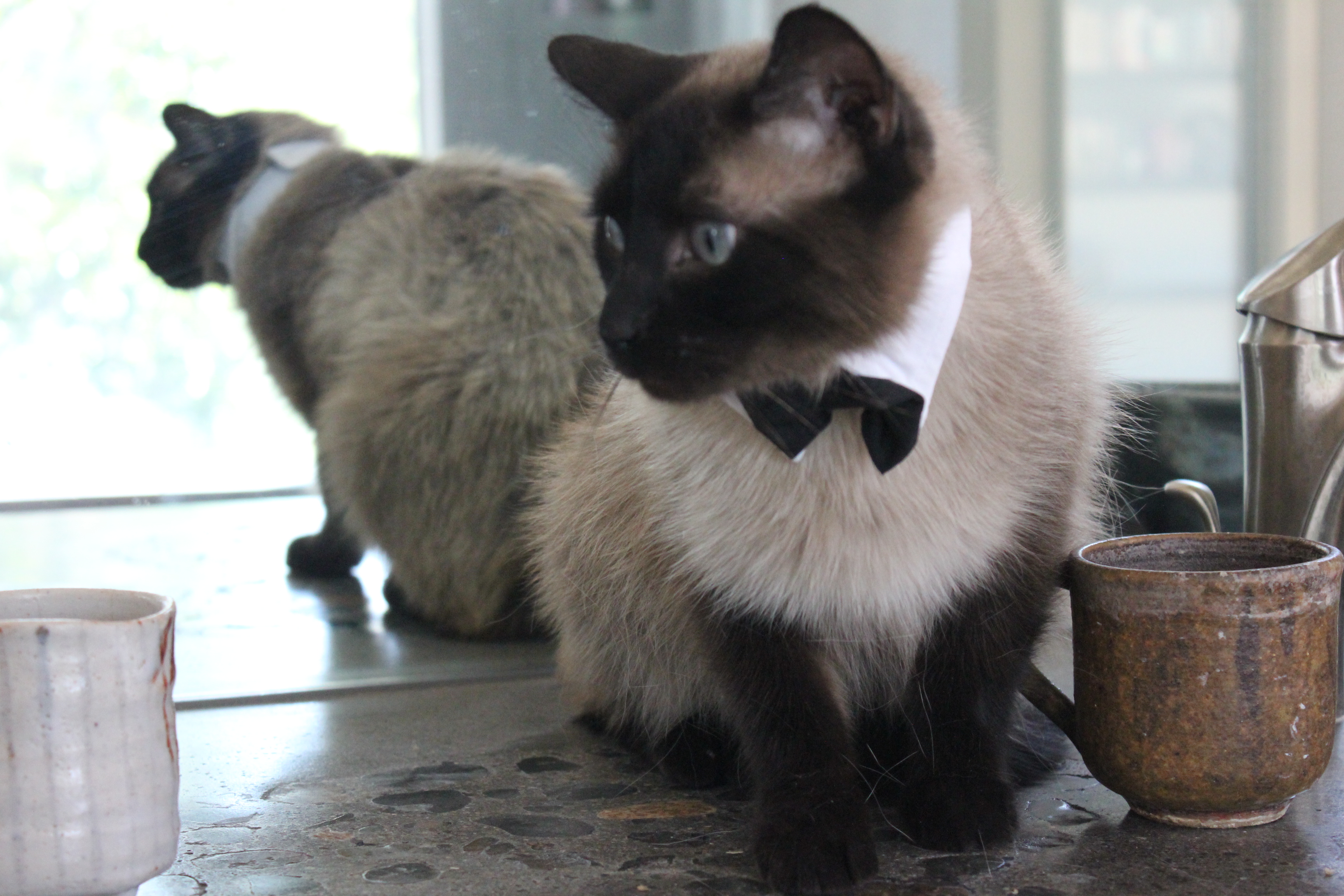 From the contents of his apartment we helped pack up when he joined the Army, I think that what Tuna and Nick have been through are hours of metal hefting, action films and sit coms, but Nick did like to box with his cat in a funny little guy-game. Tuna lived in our barn while the soldier was in training and on his post in Germany (during which time he met Hope and her kinders) and during his “year abroad” in Afghanistan. Hope put her foot down; the cat would not be the best “man” at their wedding. Nick had bought him a Chippendale-style bowtie just in case. At great expense, he had shipped the cat from California to North Carolina when he started Special Forces training, even though I told him they surely have cats on the east coast.