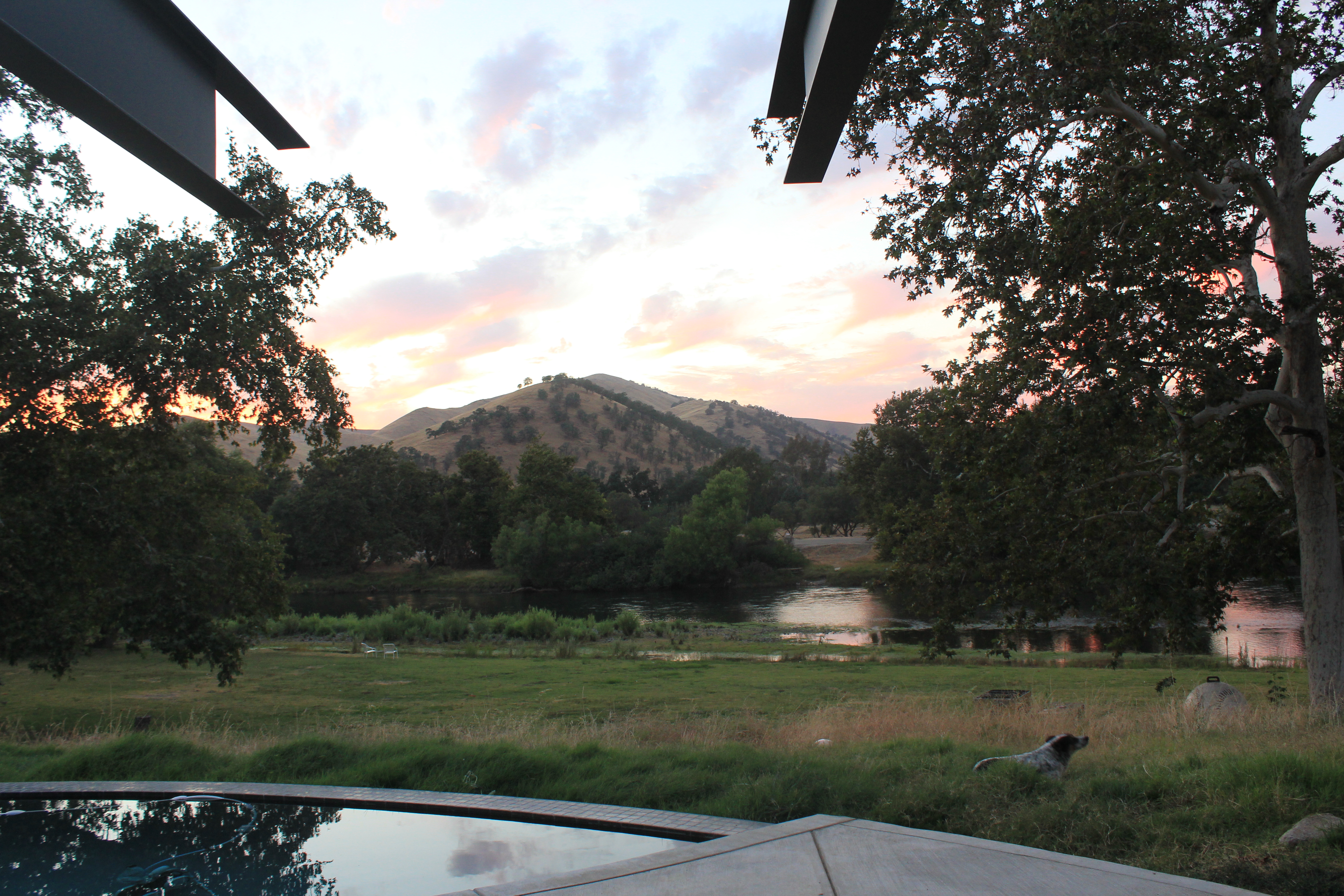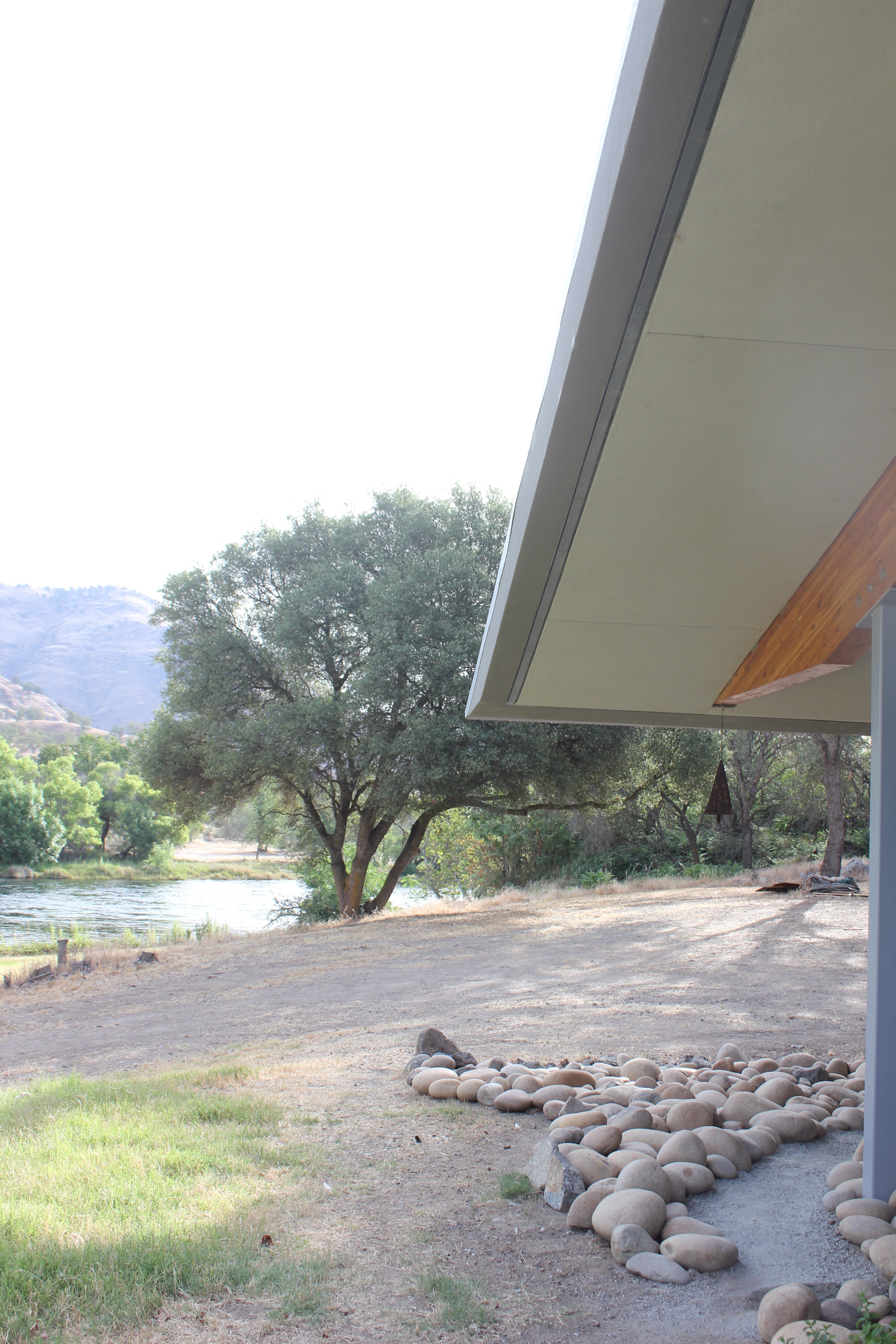 So, it’s more than location, location, location. Truly, this place would still be beautiful if I were writing from a converted container this morning, but, forced outside of the confined corners, I’d be a little chilly still, and later I’d be hot. The view would be vast and beautiful, but unfocused, not trained on Choinumni Hill with its dramatic shadows and contrasting yellow grass and dark green oaks. I’d be disturbed by the traffic, all the commuters would see me in my swimsuit and sweatshirt (I’m rockin’ this outfit!), and I wouldn’t be calmed and embraced by the curve of the walls around me, my eyes encouraged to lift up to take in the whole view included under the arched beam and roofline that mirrors the hills across the river. I probably wouldn’t sit still here long enough to finish this post.