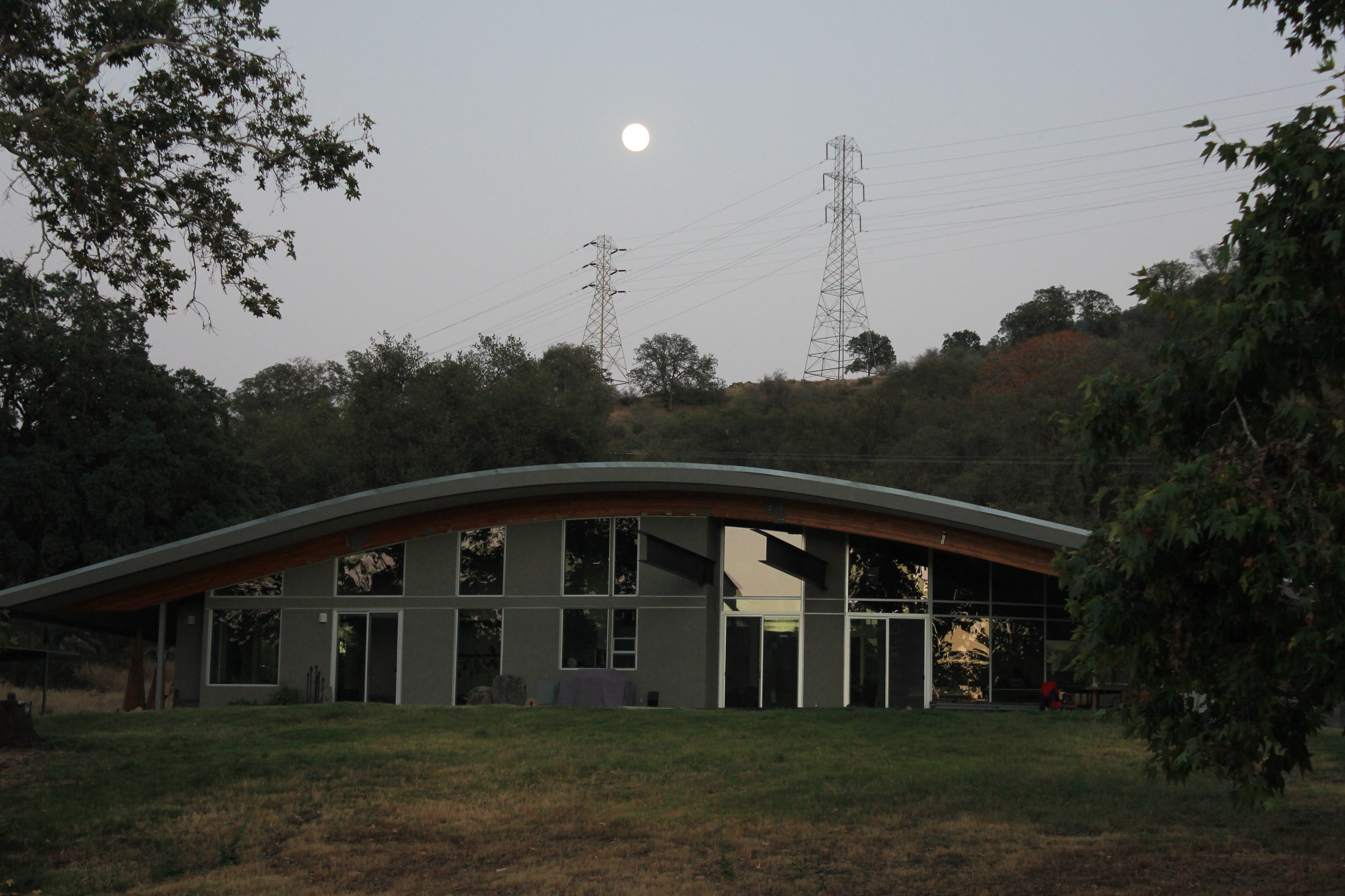 Last night, as we lingered at the river’s edge throwing rock after rock in the water for Haley, the Queensland pup, the house looked as if it was designed to showcase the full moon. The sun lingered too, and the camera couldn’t see what my eye could: the silver-white orb of the full moon, the silver-white curve of the roofline underlined by the wood glu-laminated beam, the bank of windows reflecting the sunset and the kinetic river.