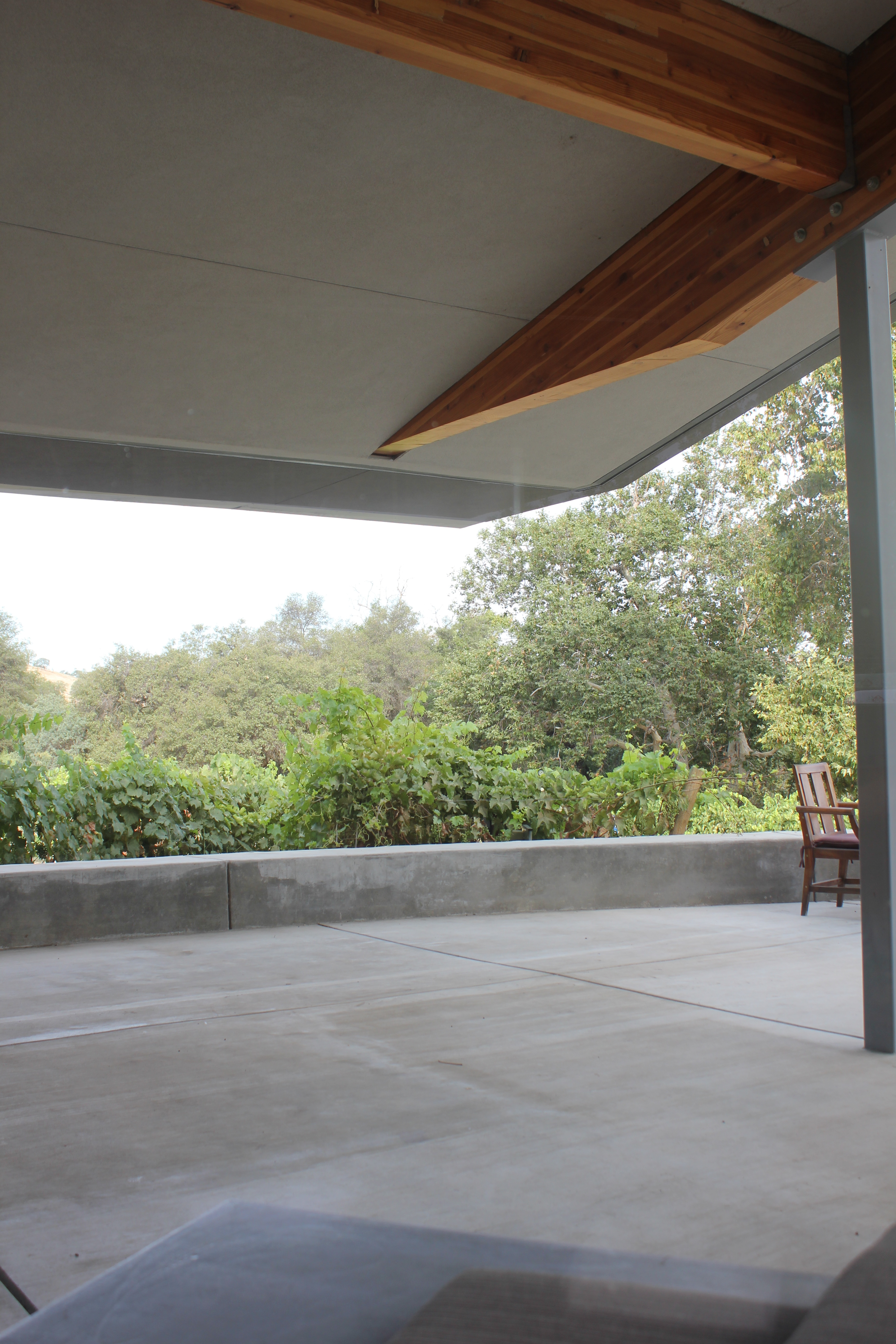 A raised concrete bench and grapevines hide the pool equipment from view and a 15-foot overhang protects from the summer sun.