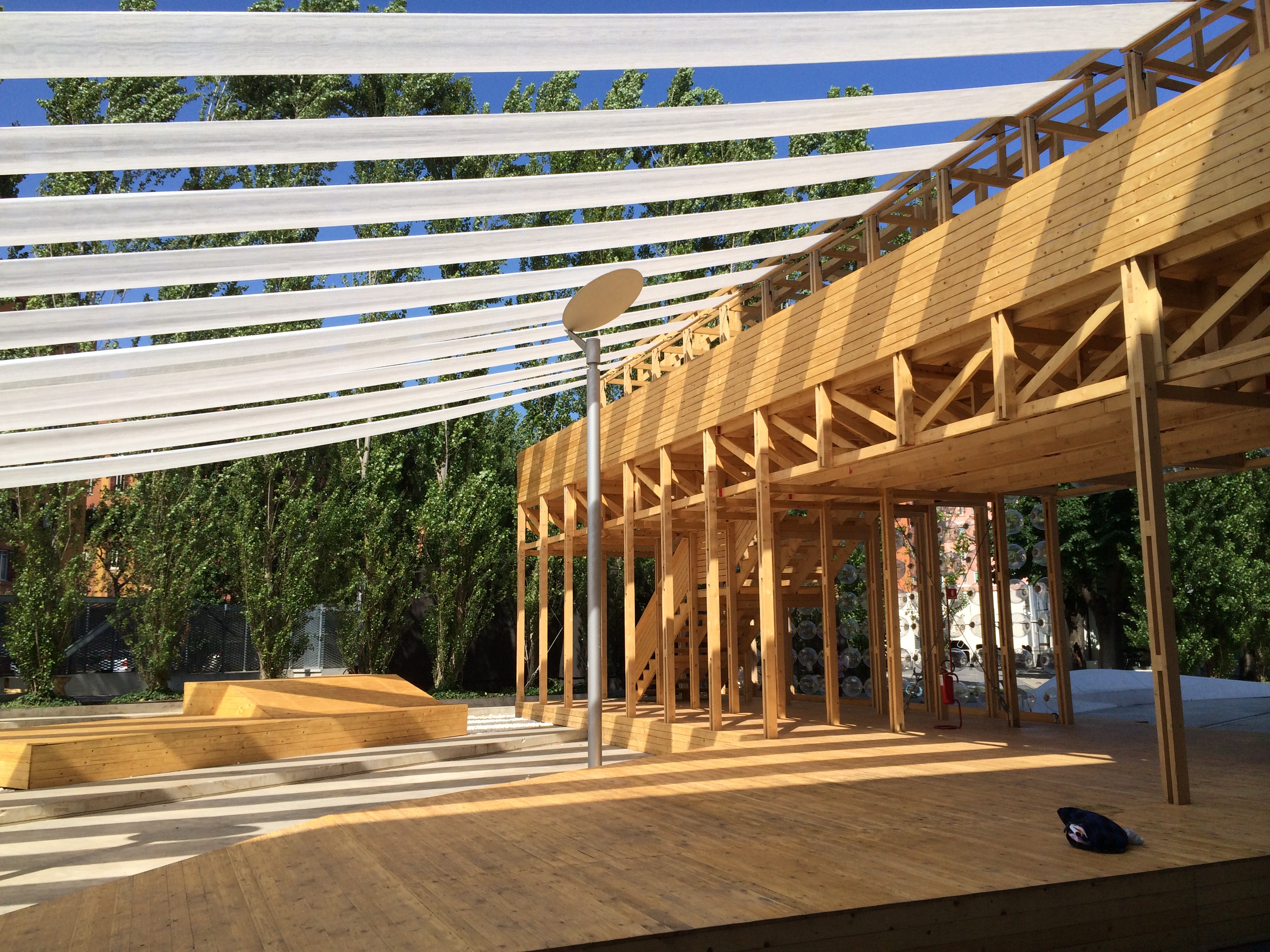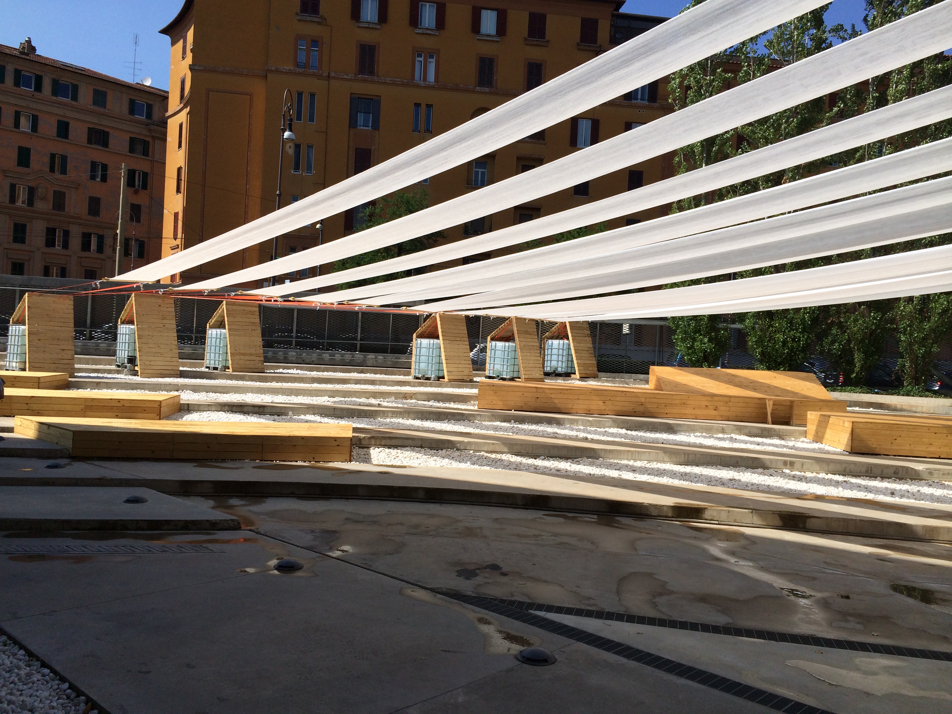 In Rome last week, we rode bikes up to see MAXXI, Saha Hadid’s arts center and were impressed by the shade structure in the pavillion (Rome is also hot in summer):