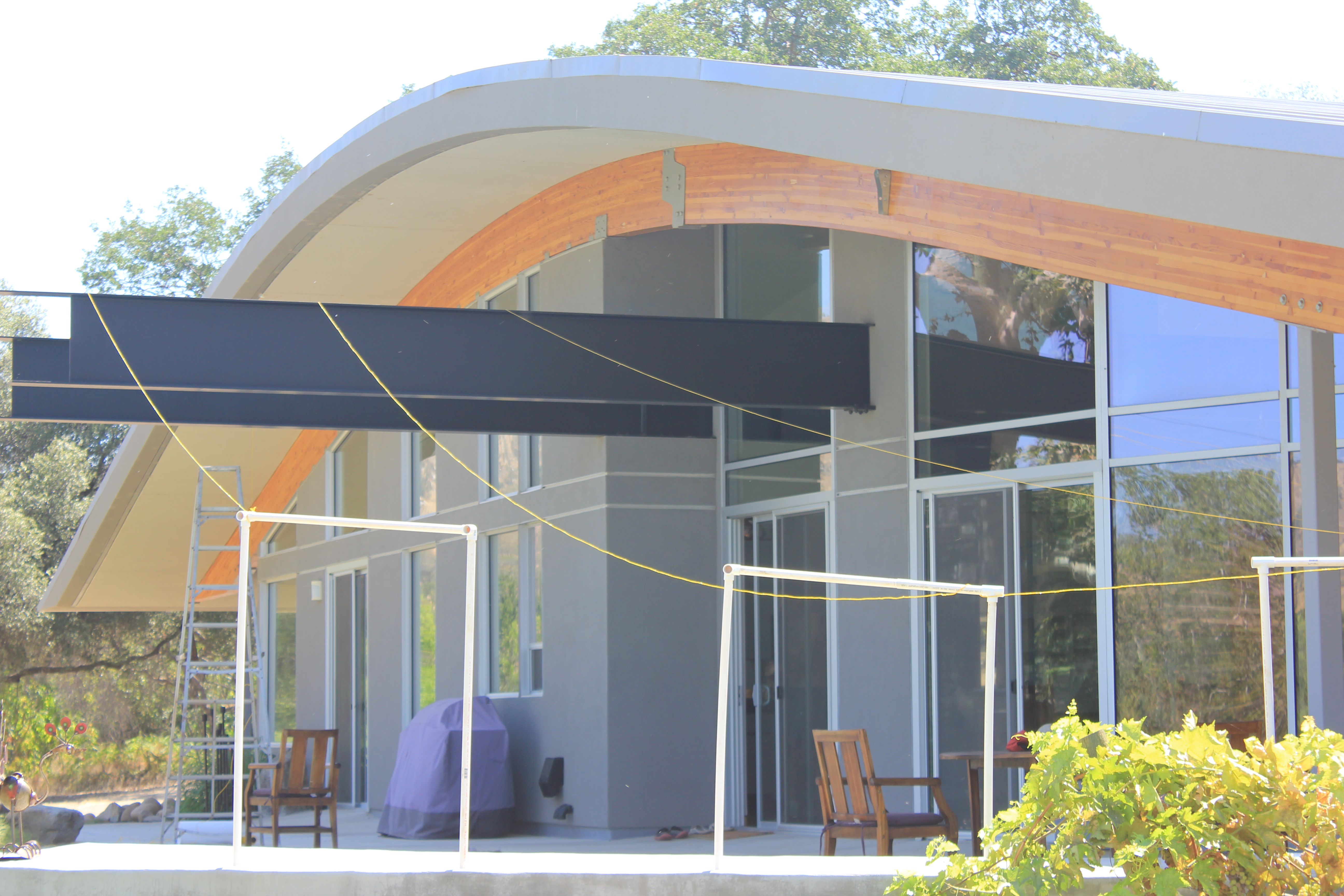 We left them up for 24 hours, and it seems it will cut about half of the sun during the 4-6PM swelter, and it may look graceful as it complements the curve of the roofline and will sway in the breeze. In the evening and the morning, though, we may wish for our unimpeded view. Even now, at 2 in the afternoon, it’s cool on the terrace under the overhang and cooler in the house.