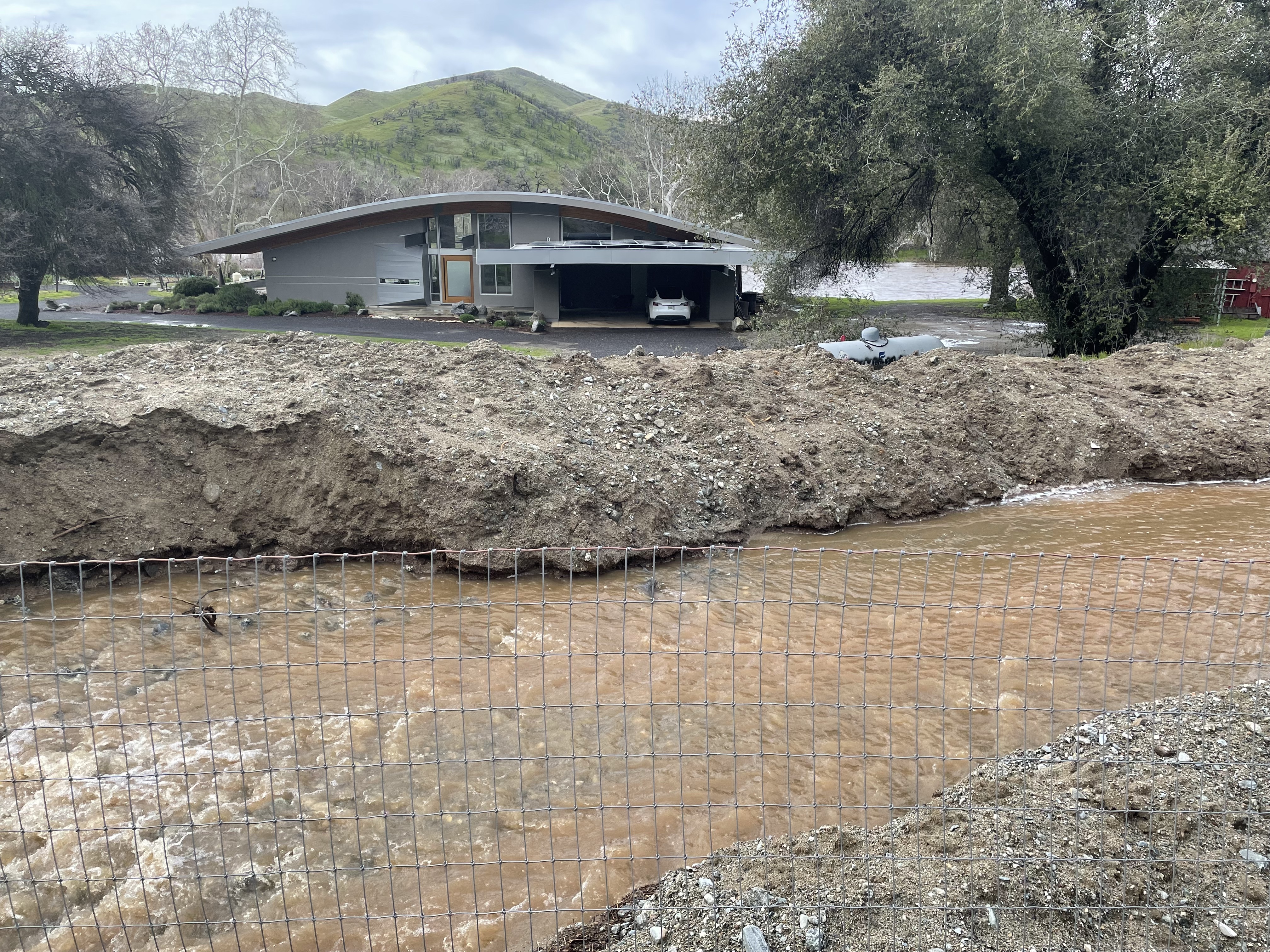 We improved drainage in front of the carport, and here on the Tractor Flat, all gathering in the French drain to the river. We were never in peril. The house was never in peril. But, if there was a mudslide, we might be stuck, unable to drive out. So, we packed one car for evacuation 2 miles down the road, out of the mudslide zone. Thankfully, an unnecessary precaution. (so far…)