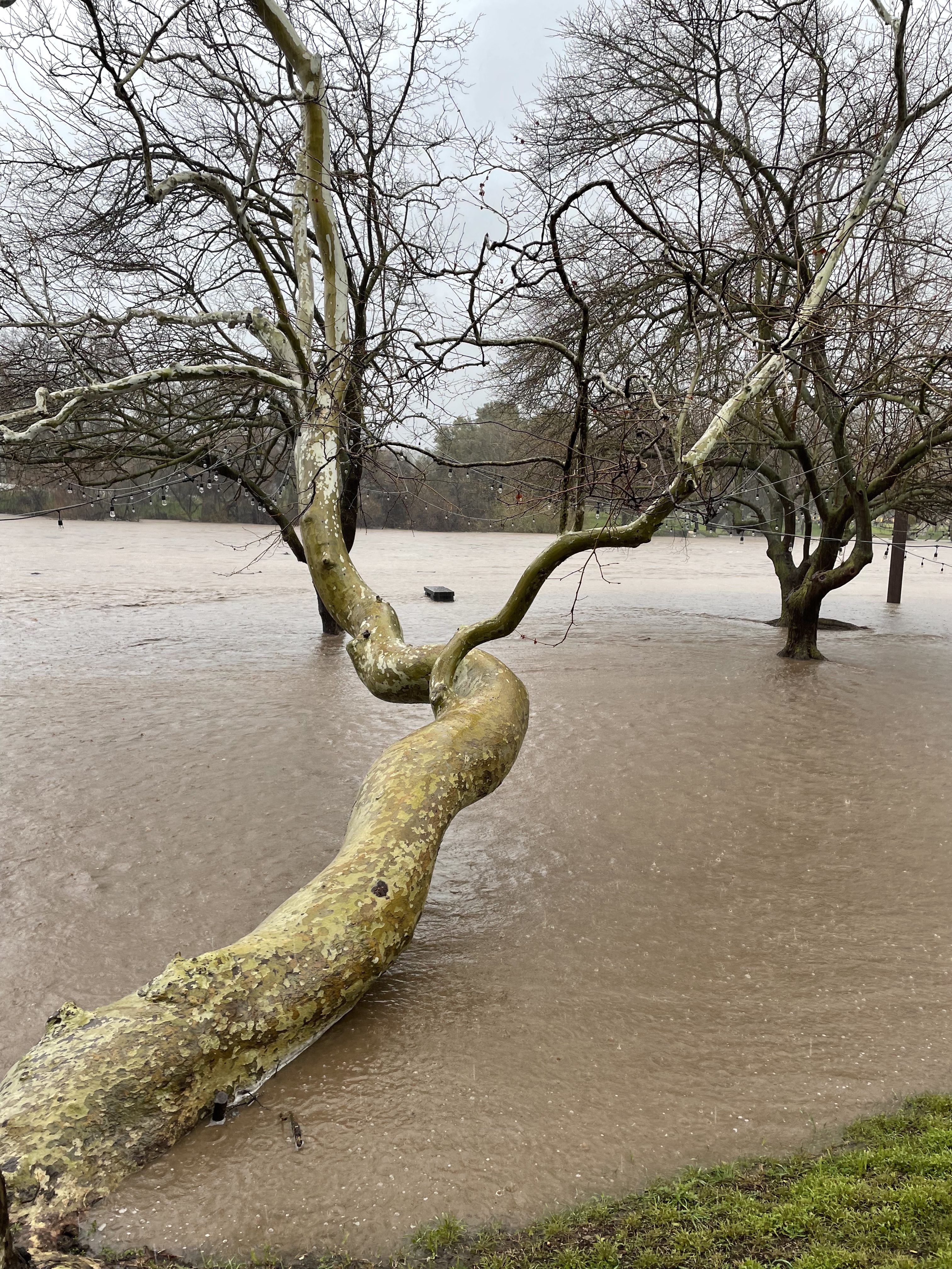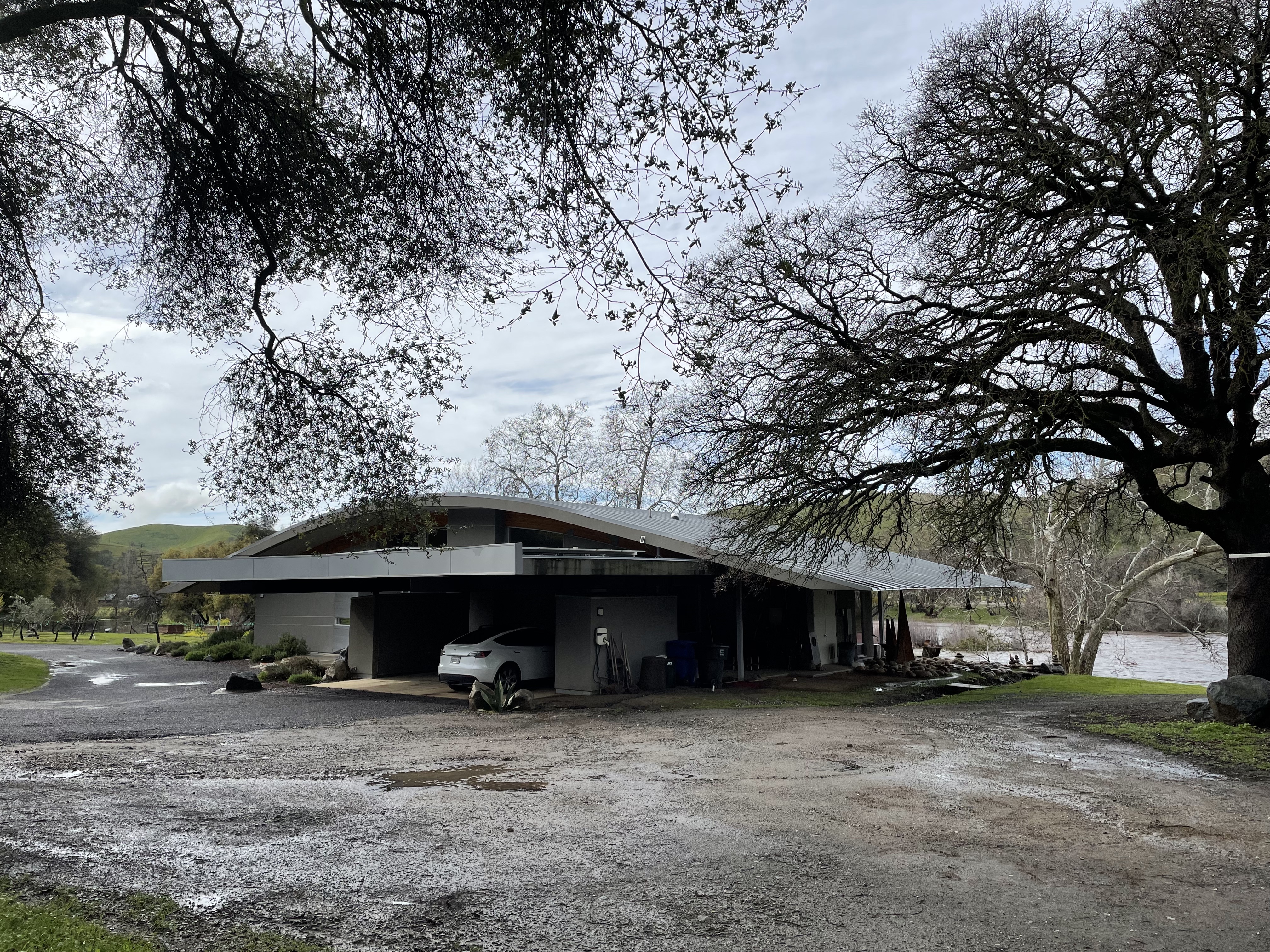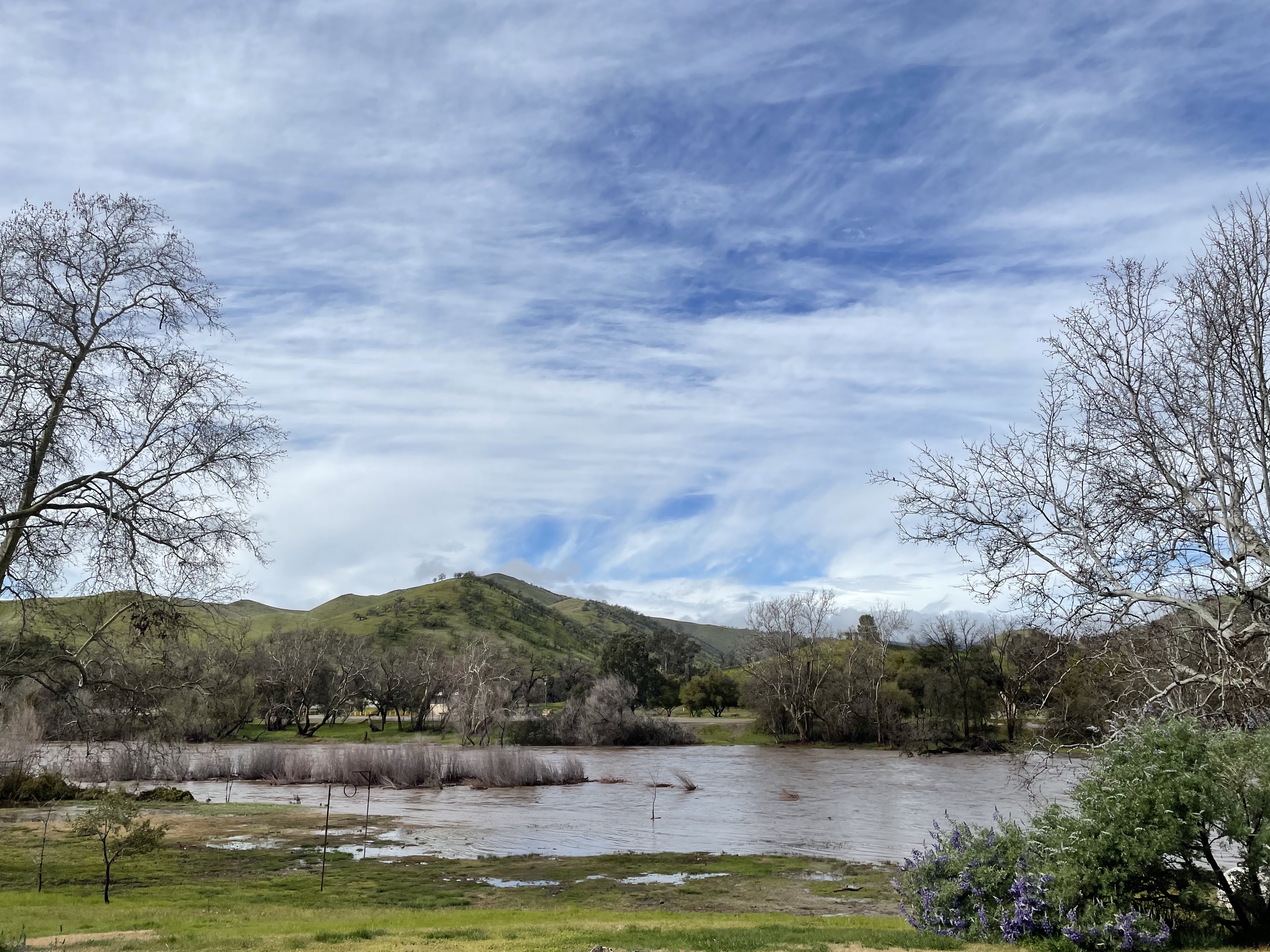 They call them Atmospheric Rivers, weathers of water flowing on the wind. While they’re not rare here–even in the land of drought–we’ve had a barrage this year of three significant storms. The first two were Arctic, dumping snow; and, at our house, mud, sliding off Tivy Mountain, since the culverts clogged and the deluge ran over the road. Today’s was a Tropical River; they call it the Pineapple Express. Mill Creek hit almost 20,000 cubic feet per second (deadly fast) and flooded the Kings River.
